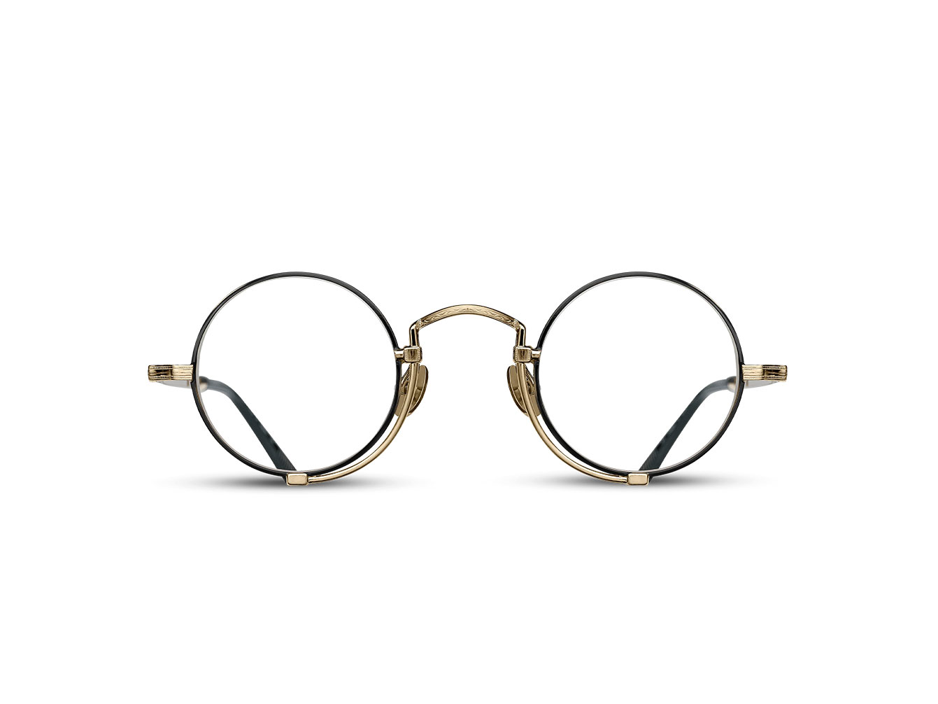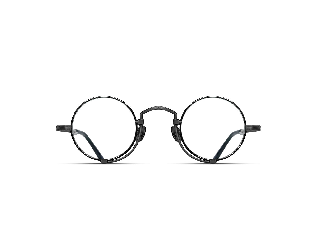 The Matsuda 10103H is constructed from lightweight titanium with hand-applied lacquer and signature M+N engraving throughout. Titanium nose pads complete the pince-nez-inspired construction.