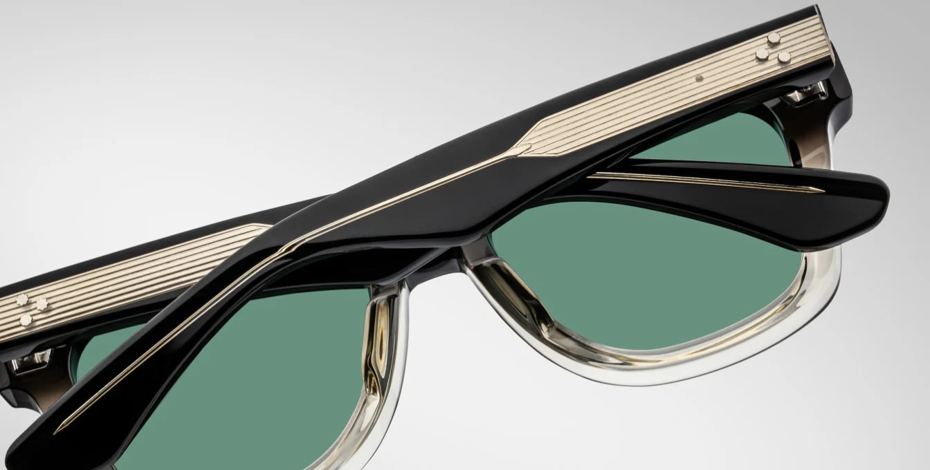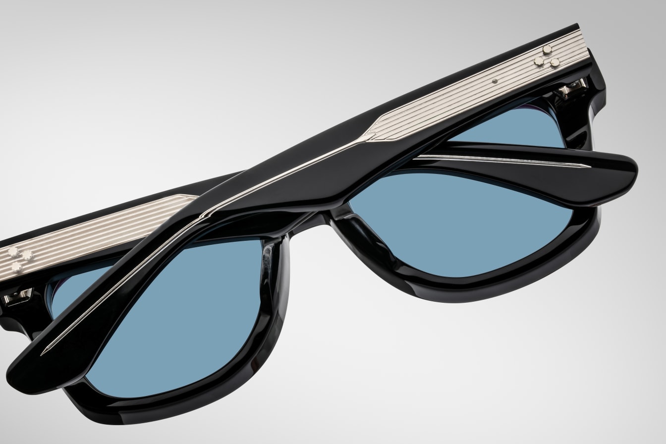 BLACK 10MM CURED CELLULOSE ACETATE FRAME WITH CUSTOM DOUBLE LAMINATED ACETATE TEMPLES FEATURING PRECIOUS METAL HARDWARE AND BLUE LENSES