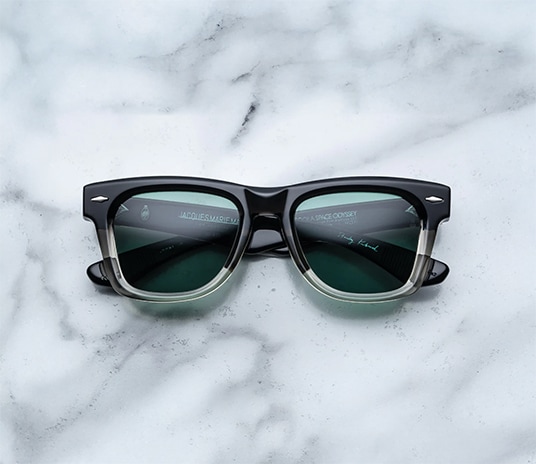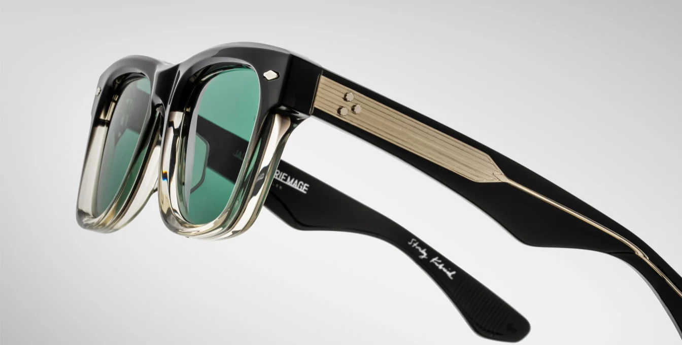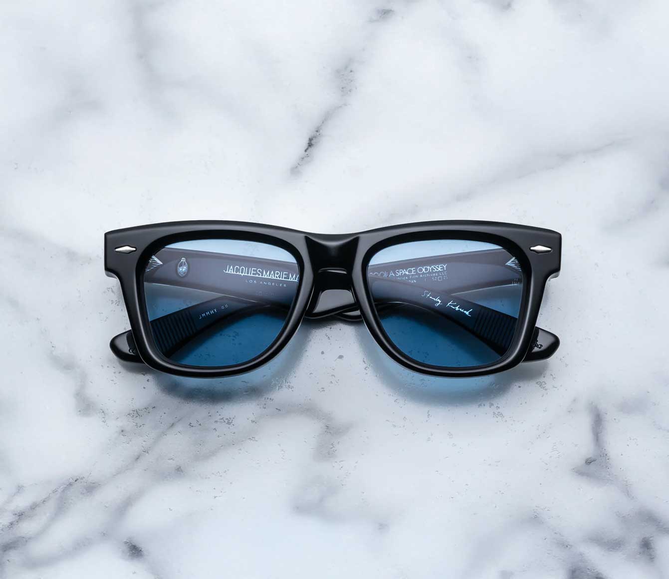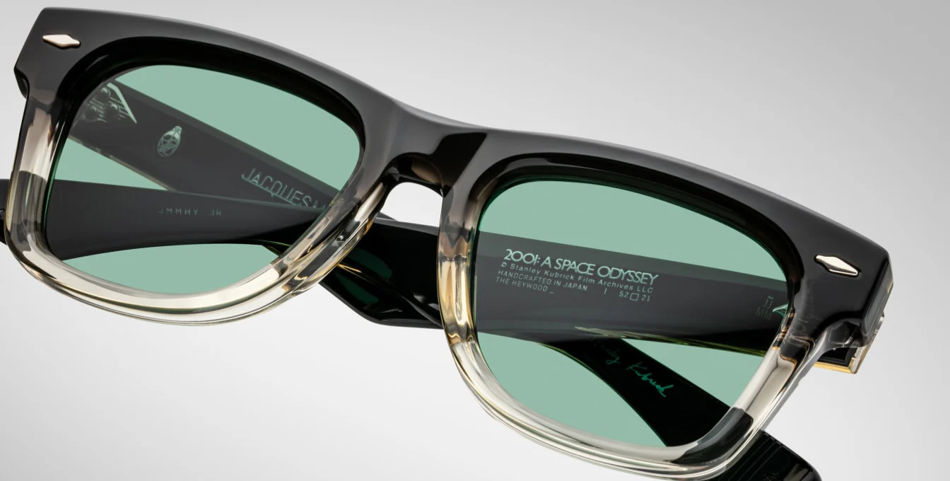 Sculptural ’60s-inspired spectacles featuring signature arrowhead front pins, exposed ‘Classic’ wirecores with hairline details, and inner temples with foil-stamped Stanley Kubrick signature and collection hallmarks.